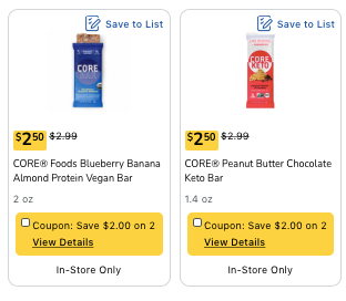 There's a $2 CORE Refrigerated Keto Bar, see offer details and a $2.49 CORE Refrigerated Blueberry Banana Oat bar Ibotta offers. In addition, if you buy both at the same time, you can use the $2 off 2 CORE bar digital coupon.