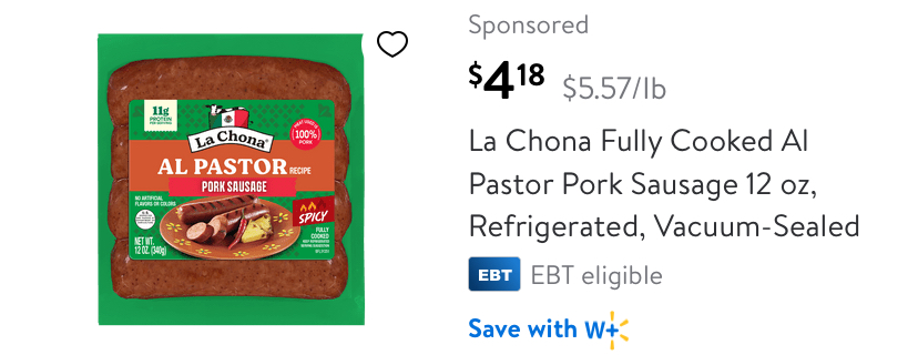 Walmart sells the La Chona Pork Sausage for $4.18 and there's a $3/98/2 La Chona Pork Sausage ibotta ofer.